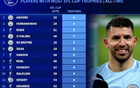 英联杯夺冠次数排名:阿圭罗费鸟6次居首,曼城诸将在列